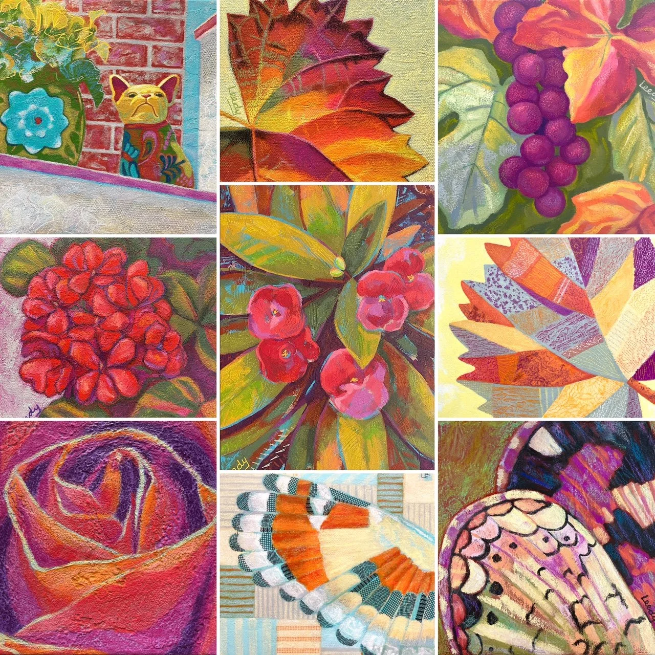 After experimenting with many paints, papers, fabric, and tools, my current work consists of acrylics, wax pastels, and (often) collage on gallery-wrapped canvas.